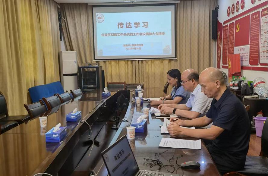 9月28日下午,我部在二办公楼二楼会议室召开专题学习会,传达学习省委贯彻落实中央统战工作会议精神大会精神。校党委委员、统战部部长杨念主持会议。