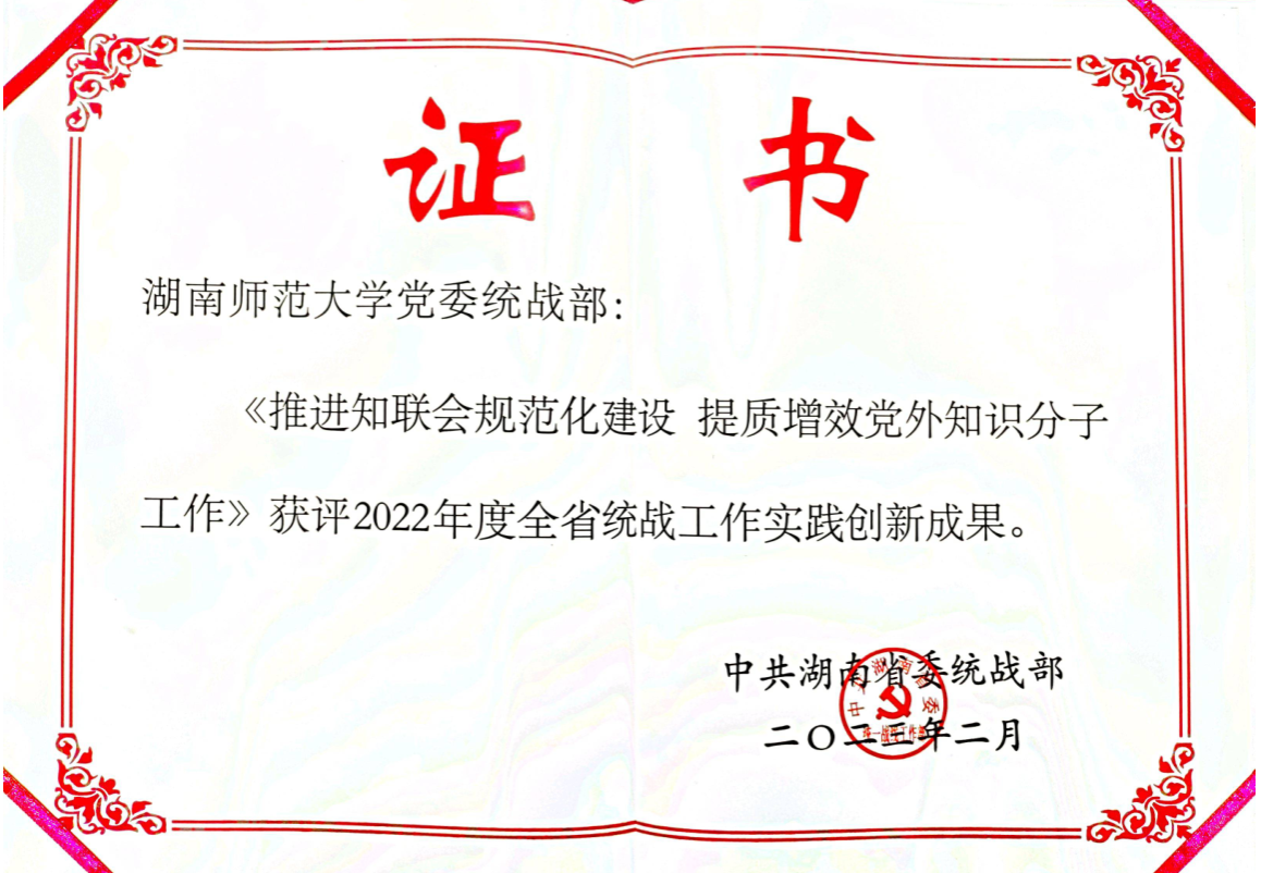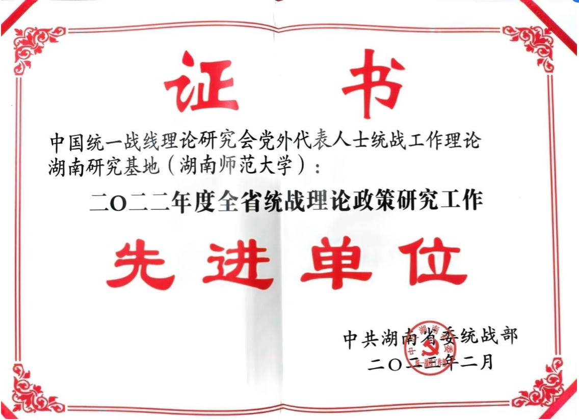 近日,湖南省委统战部通报表彰了2022年度全省统战信息工作、统战理论政策研究工作和统战工作实践创新成果,williamhill中国官网《推进知联会规范化建设提质增效党外知识分子工作》获评2022年度全省统战工作实践创新成果,校党外代表人士统战工作理论湖南研究基地荣获2022年度全省统战理论政策研究工作先进单位,2人获全省统战理论政策研究工作先进个人。